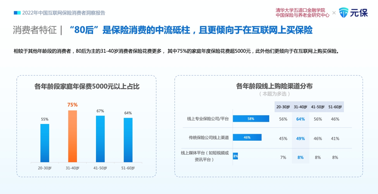 《报告》显示,相较于其他年龄段的消费者,80后为主的31-40岁消费者保险花费更多,其中75%的家庭年度保险花费超5000元,此外他们更倾向于在互联网上购买保险。