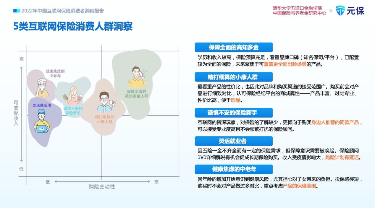 为便于互联网保险机构更精细化地为消费者提供服务,《报告》聚焦于五类颇具代表性的互联网保险典型人群——保障全面的高知多金、精打细算的小康人群、谨慎不安的保险新手、灵活就业者、健康焦虑突增的中老年;针对每类人群,从群体特征、购险特征和购险消费各环节特点等几方面,详细阐释了不同消费人群的需求、偏好、购险行为习惯、关注点和未来购险计划。为业界提供了更具细致专业和执行性的建议。