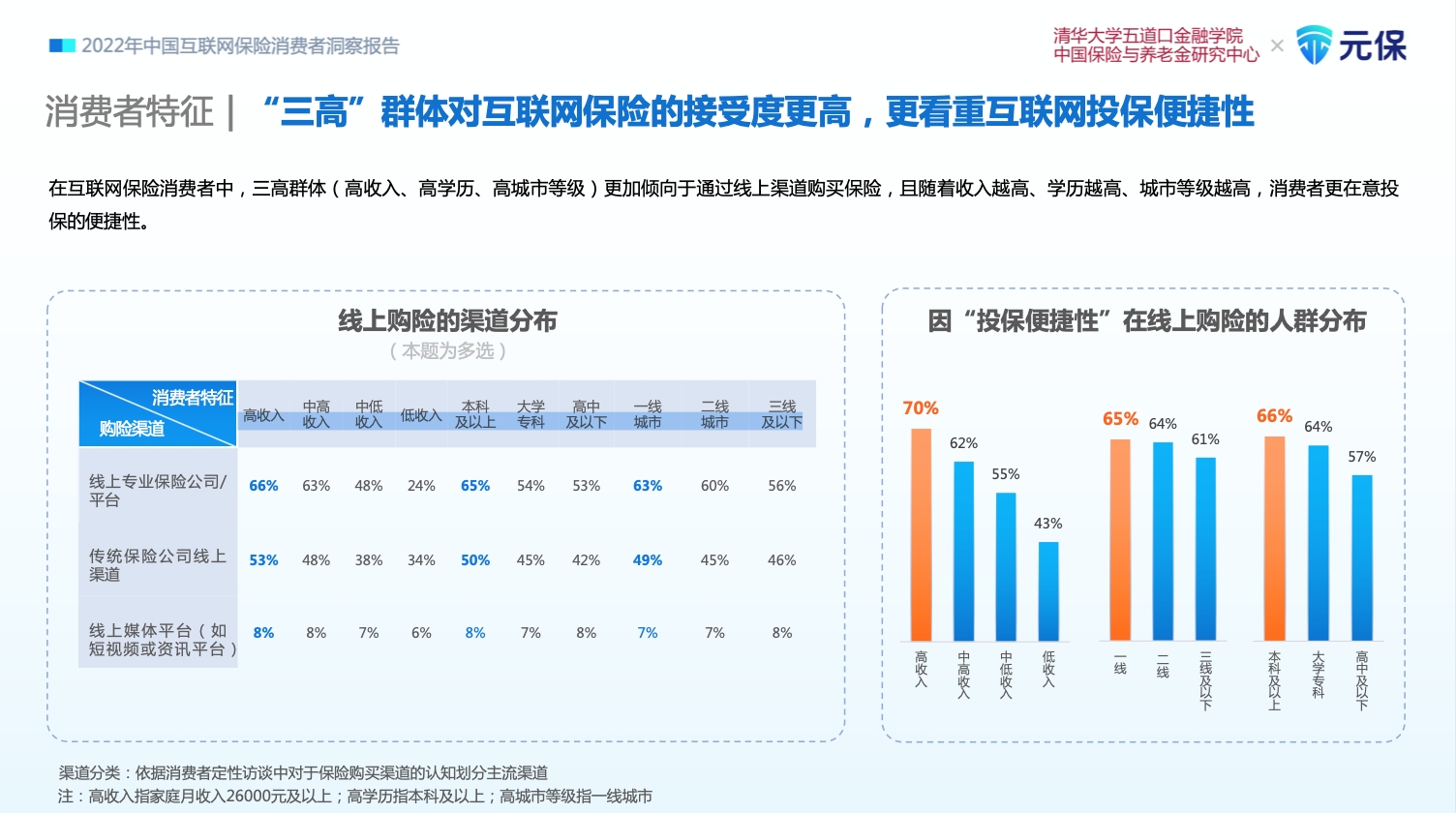 《报告》显示:疫情三年,用户对互联网更加依赖,加速了保险数字化进程。调研发现,超8成消费者未来会考虑在线上购险,其中线上专业购险保司/ 平台的增长潜力最大。保险消费者中,购险年限越长的消费者越倾向在互联网上买保险。三高群体(高收入、高学历、高城市等级)更加倾向于通过线上渠道购买保险,且随着收入越高、学历越高、城市等级越高,消费者更在意投保的便捷性。