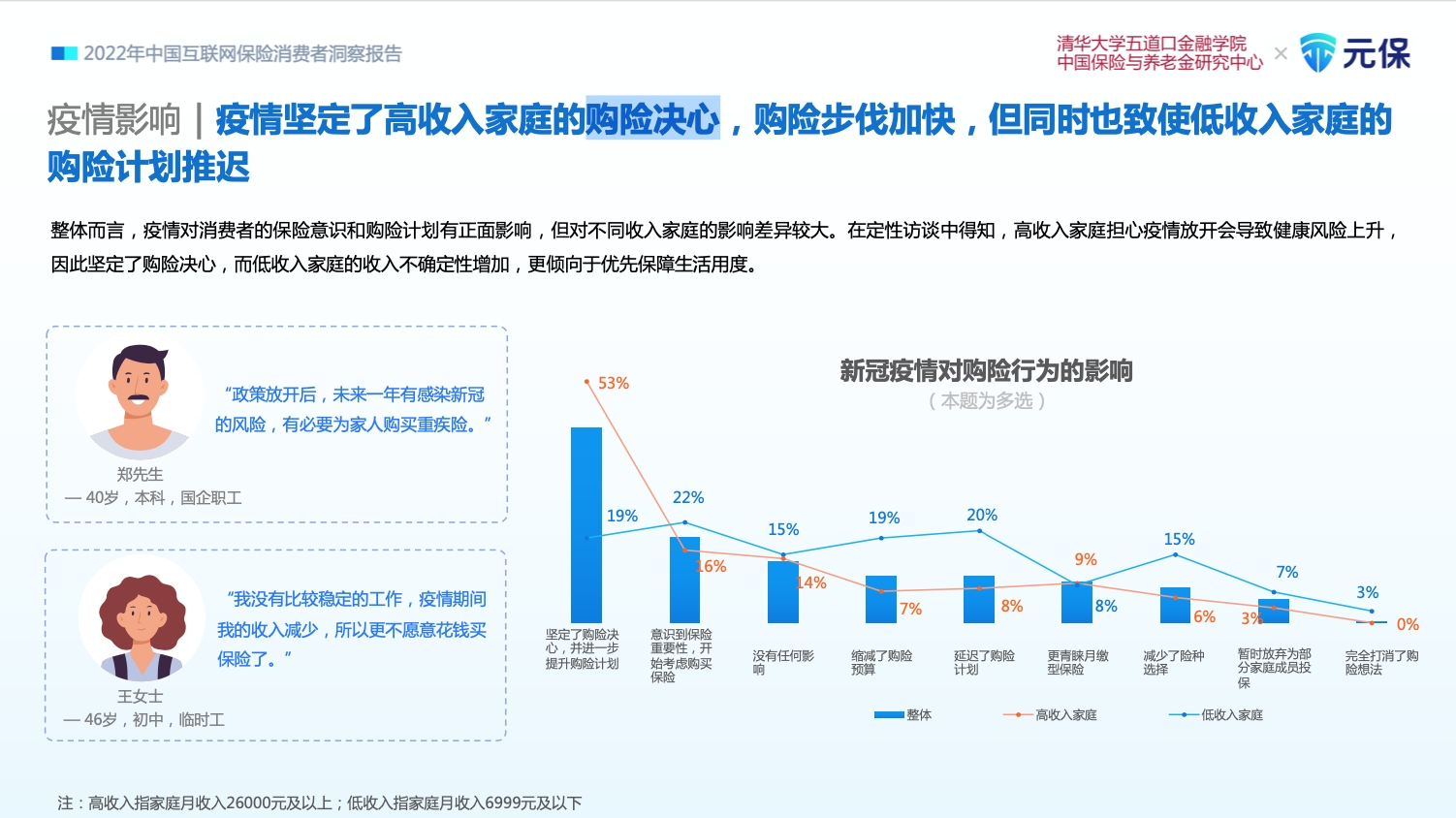 整体而言,疫情对消费者的保险意识和购险计划有正面影响,但对不同收入家庭的影响差异较大。在《报告》所做的定性访谈中得知,高收入家庭担心疫情放开会导致健康风险上升,因此坚定了购险决心,而低收入家庭的收入不确定性增加,更倾向于优先保障生活用度。