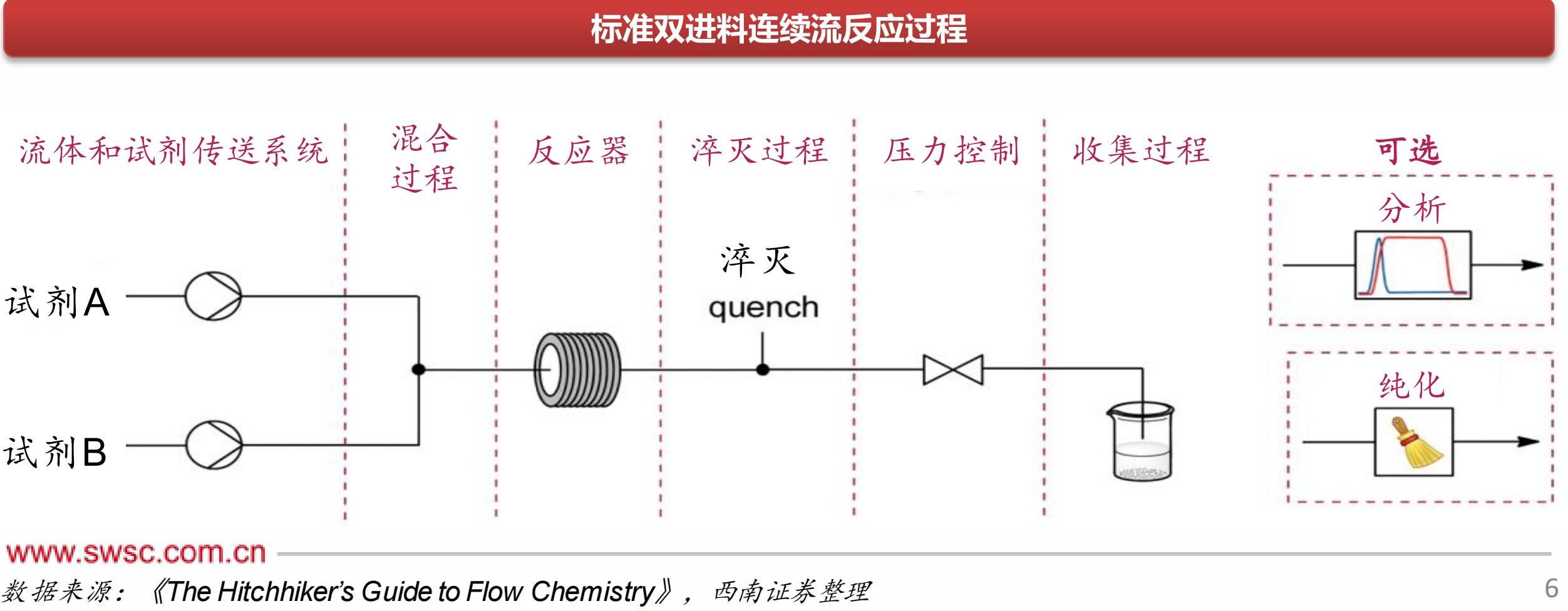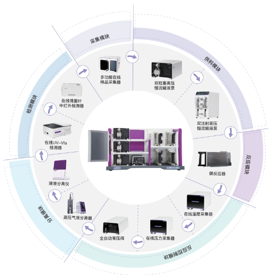 而作为一种模块化技术,连续性反应为合成化学家提供了一套工具箱。一般来说用于合成反应的典型连续流装置可分为八个基本区域:流体和试剂递送、混合、反应器、淬灭、压力调节、收集、分析和纯化。