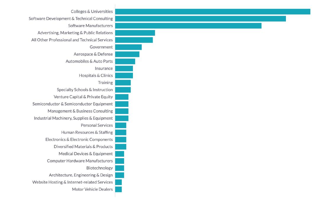 上面表格的应用覆盖了设计、文生图、电商销售、支付、协同办公、关系管理、教育、社交、新闻等场景。这些可能还只是冰山一角,更多可挖掘的智能化应用还在路上。美国研究机构最新数据显示,全美有1116家公司正在使用OpenAI的技术、产品,公司所处的行业前五名包含了软件制造商、广告、营销和公关等。