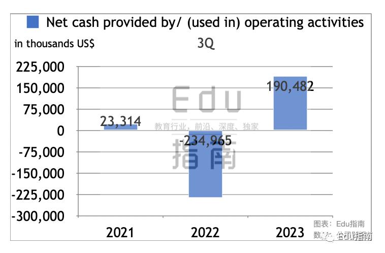 新东方Q3经营活动现金净流入额为1.9亿美元,上一财年为净流出2.3亿美元,2021财年Q3为净流入2331万美元。本财年该项从上一财年的流出转为流入,且净流入额高于2021财年Q3时期表现。