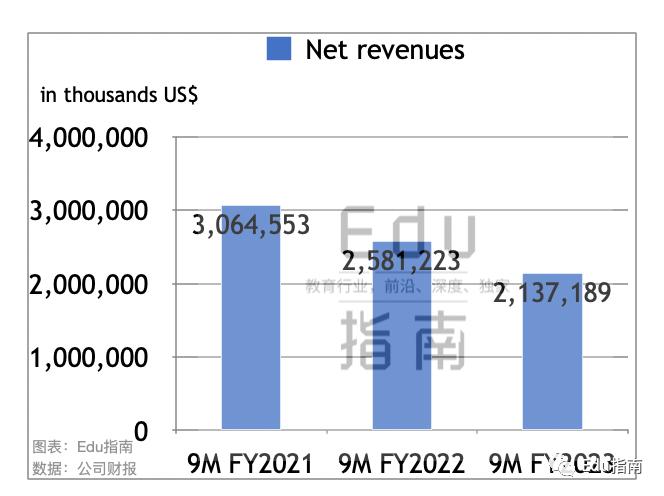 2023财年前三个季度新东方公司营收为21.4亿美元,同比上一财年同期的25.8亿美元,营收下降17%。该公司2022财年前三季度营收同比2021财年同期的30.6亿美元,表现为下降16%。即新东方前三季度营收降幅稍高于上一财年。
