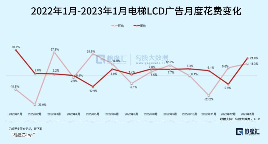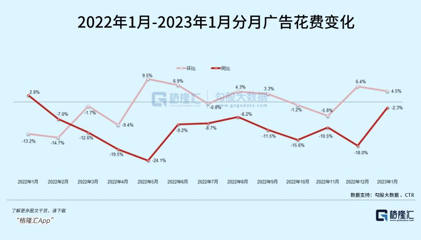 市场研究公司CTR对今年一月份的广告行业有过详细的调研统计,数据显示,2023年1月广告市场花费同比降幅收窄至近一年来的最小值,环比增长4.5%。