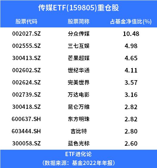传媒ETF一键打包分众传媒、三七互娱、芒果超媒、世纪华通、完美世界、万达电影、昆仑万维等40家传媒公司。