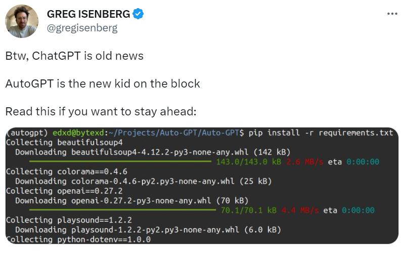现OpenAI技术大牛安德烈·卡尔帕西 称 AutoGPT是“提示工程的下一个前沿” ,因为同基于GPT-4的ChatGPT非常依赖人们输入提示词来完成任务,AutoGPT则将中间的多轮提问环节交给机器,解放依赖人类的特性,这也是为何有人称AutoGPT将会替代ChatGPT的主要原因。