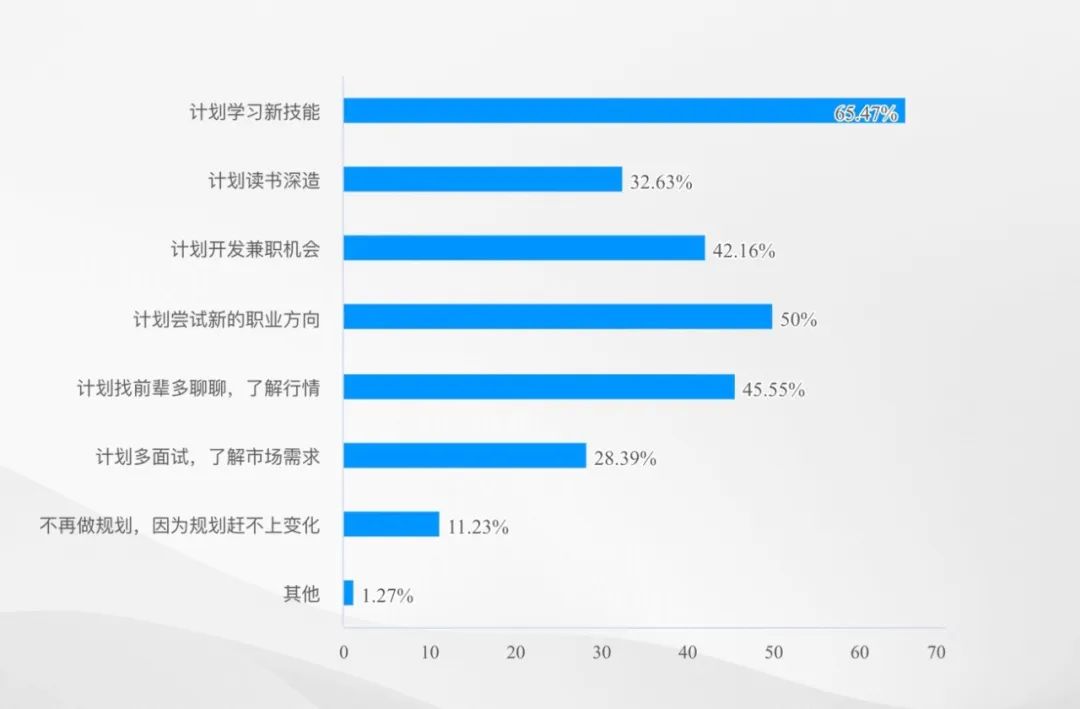在如何应对职业危机上,很多人给出了自己的计划,有学习新技能,尝试新的职业方向,找前辈沟通了解行情,开发兼职,读书深造等等。