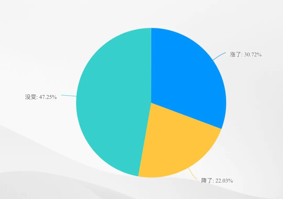 从收入来看,过去一年中仅有30.72%的人工资涨了,有22.03%的人遭遇了降薪,大部分人的工资并无变化。