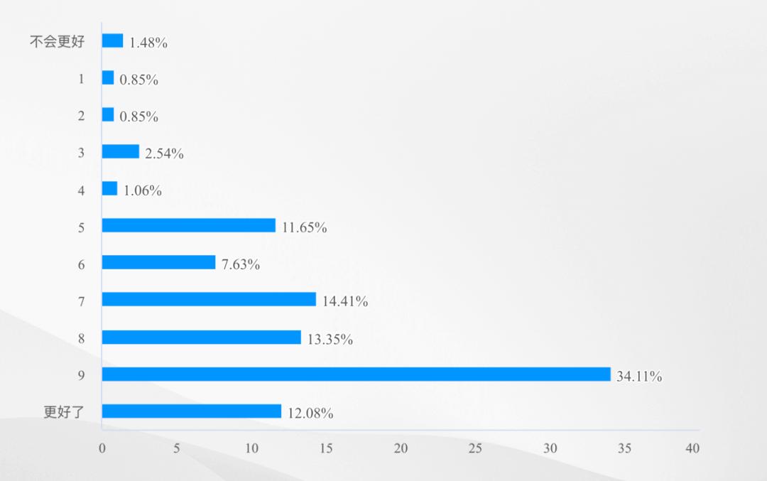 在你认为5年后的自己会更好吗的问题下,有93.22%的人给自己打了5分以上的成绩,说明大家对未来的希望都是积极乐观的。