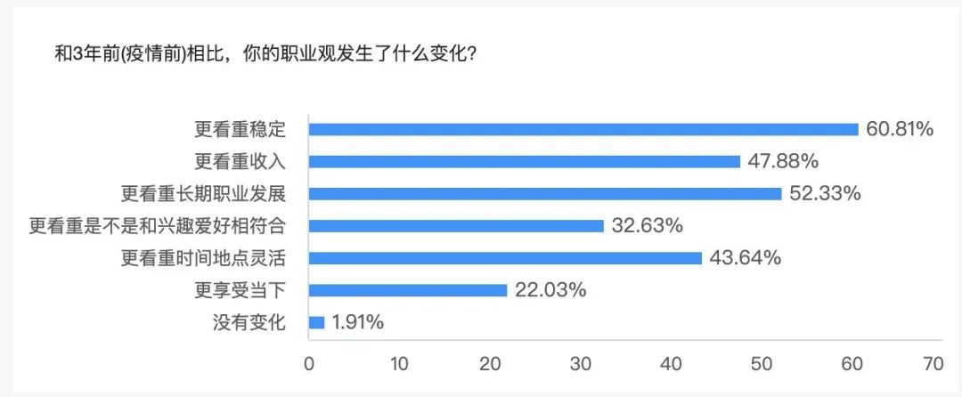 疫情三年最大的变化就是,身边在互联网公司上班的人都想跳槽去国企了,他们考虑的第一顺位从收入变成了稳定。在我们的调查问卷中,有60.81%的人选择了「稳定」。
