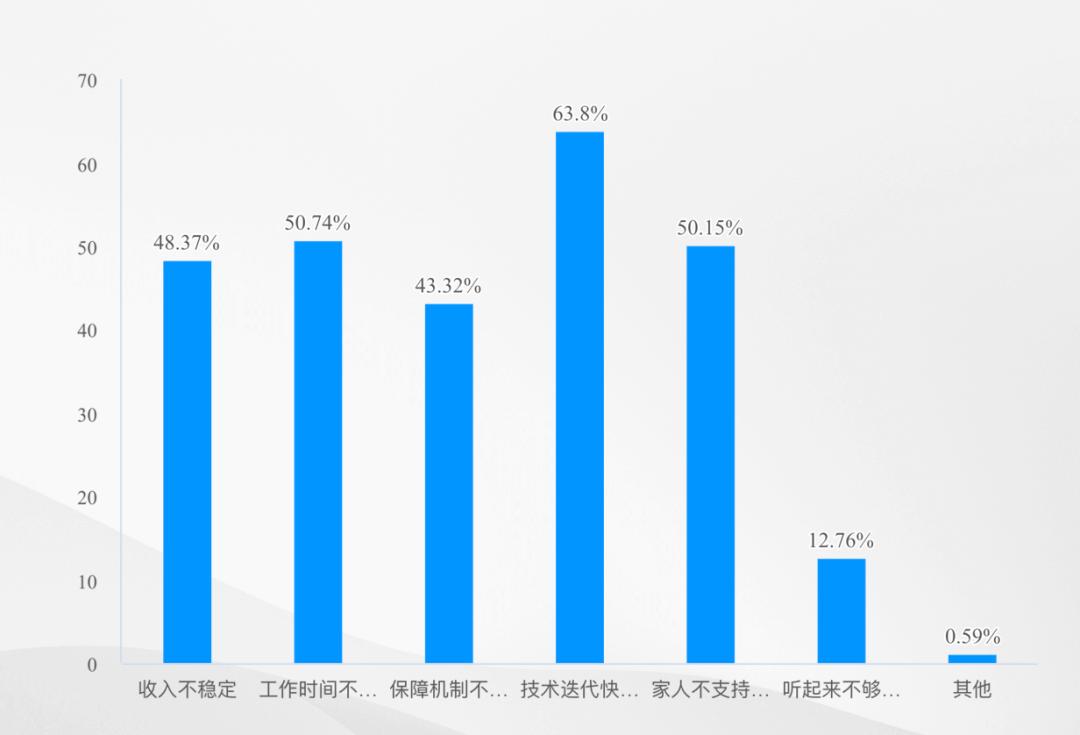 而在新兴职业的考量上,除了家人不支持作为一项主要因素外,其余四项均与稳定相关,如“收入”“时间”“保障”以及“淘汰”。