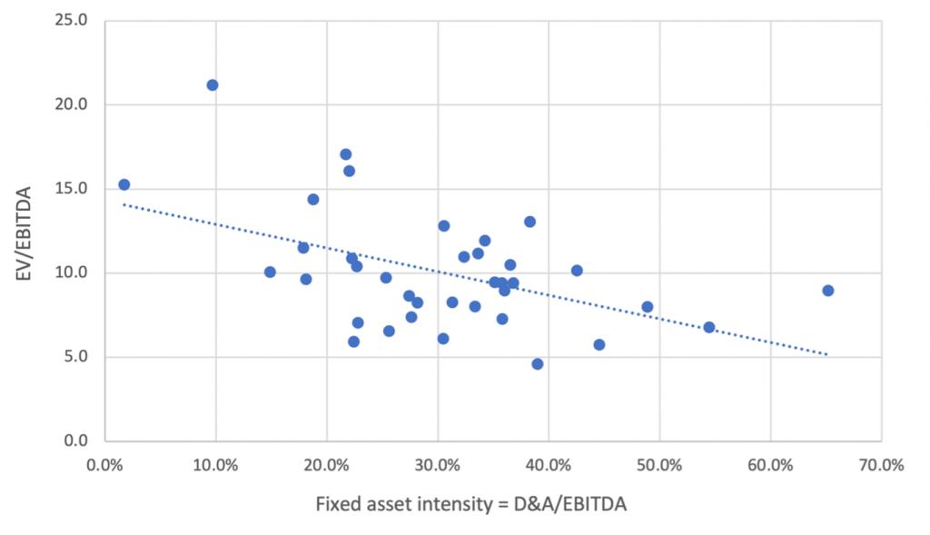 相应产生的资产折旧摊销等固定成本对公司利润形成侵蚀,因而重资产公司的估值通常采用EBITDA(息税折旧摊销前利润)作为估值的锚,以修正折旧摊销对利润的扭曲,但传统重资产行业依然普遍存在估值折价。
