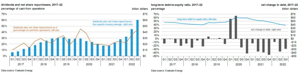 2022年第三季度,EIA跟踪的160家能源公司的运营现金总额达到2150亿美元,其中用于股息和回购的金额达到600亿美元,占经营现金流的比重超过40%,为2017-2022年期间的最高水平,与此同时长期债务权益比率降至38%。