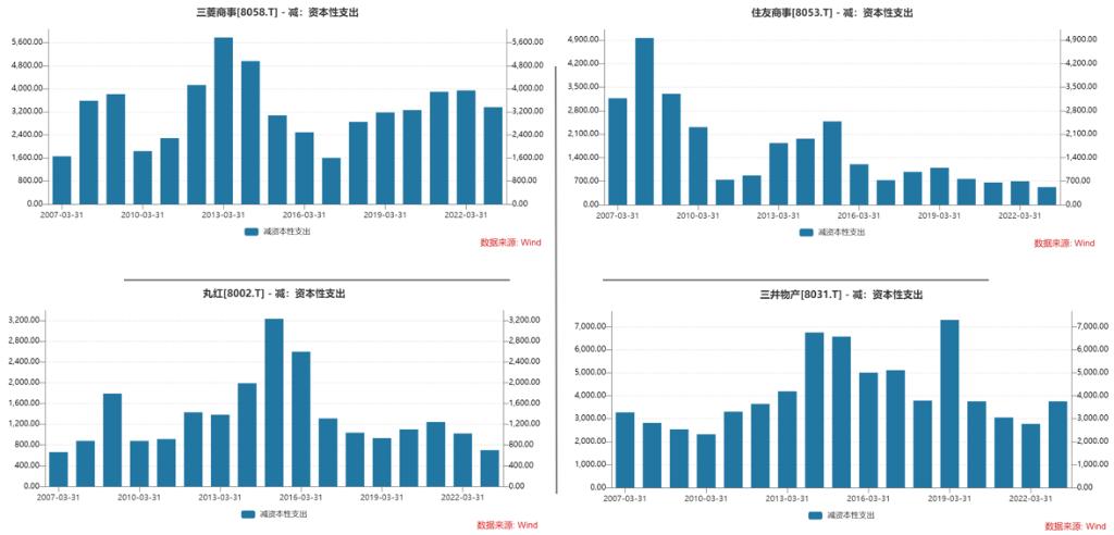 以目前营收规模最大的三菱商事为例,2011财年-2013财年其资本性支出保持在4000亿日元以上,而随着业绩滑坡,资本开支不断增长的趋势戛然而止,2014财年资本开支锐减38%。此后其经营策略进一步收缩,即便是在商品价格大涨的2021财年,其资本开支也再没有超过此前的峰值水平。