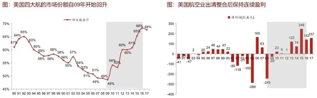 2016年巴菲特大举买入美国四大航空公司,彼时巴菲特认为,在经历了激烈的价格战竞争之后,航空业出清整合从混战走向垄断,表现为四大航司的客座率稳定保持在高位,盈利水平大幅改善。