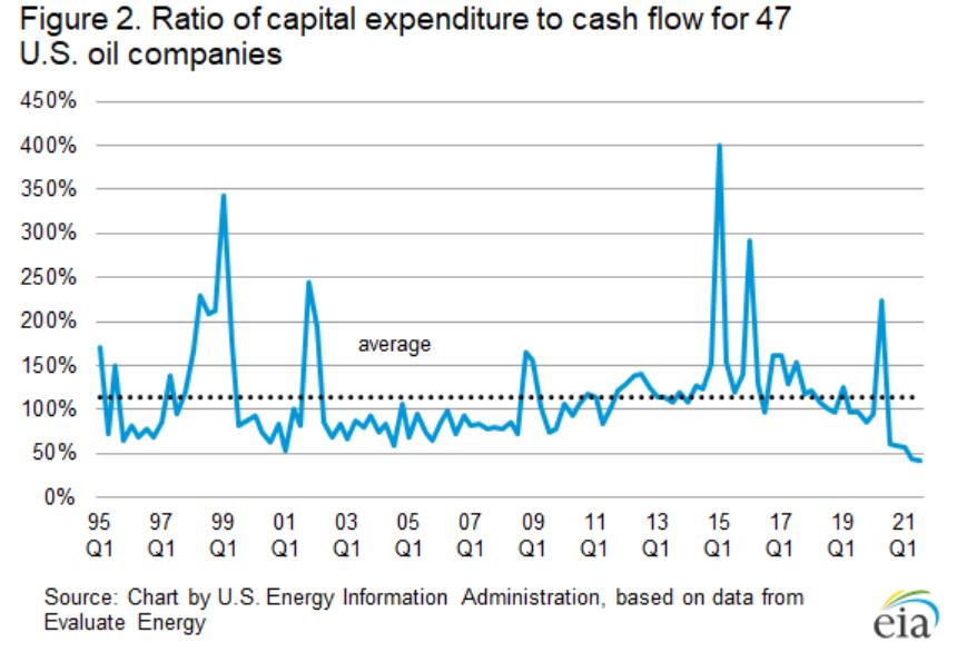 EIA公布的数据显示,2021年三季度美国47家石油公司的再投资比率 (油气资本支出与运营现金流比值) 创下历史新低(41%),为1995年以来的最低水平,即便彼时其业绩已经大幅好转。