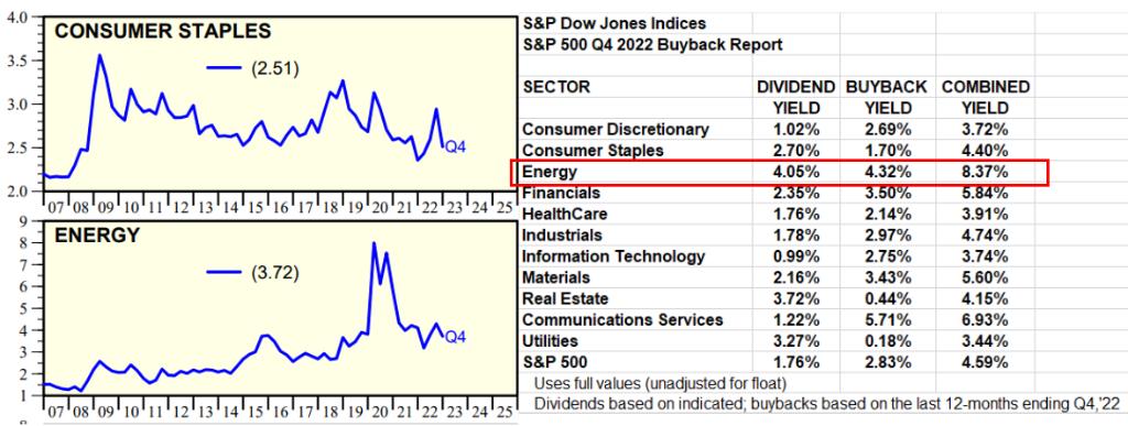 标普道琼斯数据显示,2022年标普能源板块的股息和回购回报率是所有行业中最高的,实际上从2018年开始能源板块的股息回报就已经实现了巴菲特曾经偏爱的消费板块的超越。