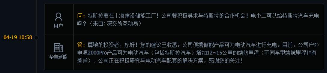 36氪获悉,华宝新能在互动平台回复投资者称,公司便携储能产品可为电动汽车进行充电。目前,公司户外电源2000Pro产品可为电动汽车(包括特斯拉汽车)增加12-15公里的续航里程(不同车型续航里程稍有差异)。公司正在积极研究与电动汽车配套的解决方案。