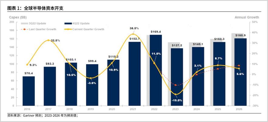 面对行业不景气和极其糟糕的业绩压力,SK海力士、美光、三星等全球存储芯片大厂不得不下调资本开支,给出供给收缩预期。根据Gartner最新预测数据,全球半导体行业资本开支2023年约为1372亿美元,同比下滑19.0%;