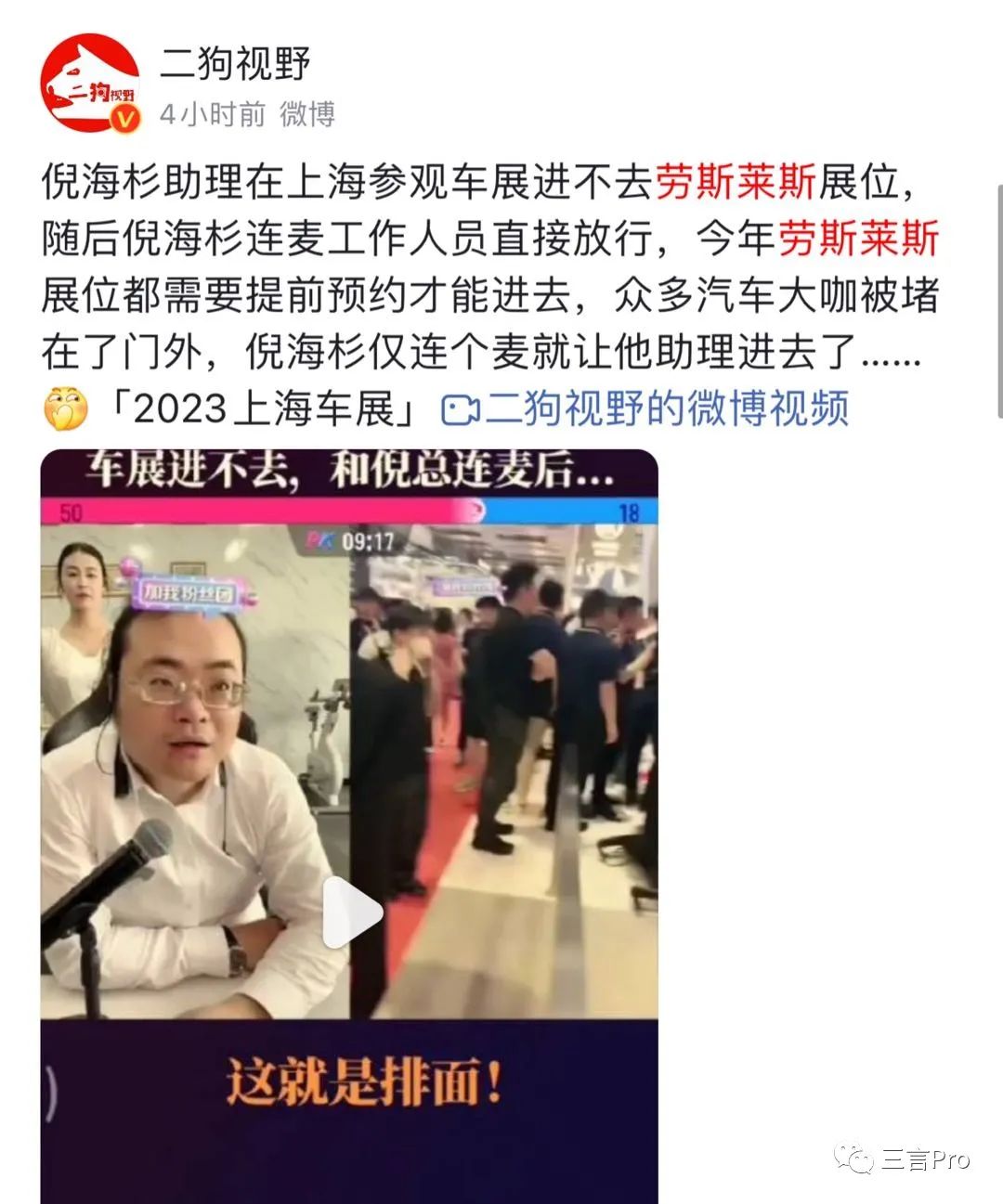 昨天网红倪海杉的小助理也参加了车展,一开始她也被挡在劳斯莱斯的展台外面,遇到了和其他博主一样的情况。