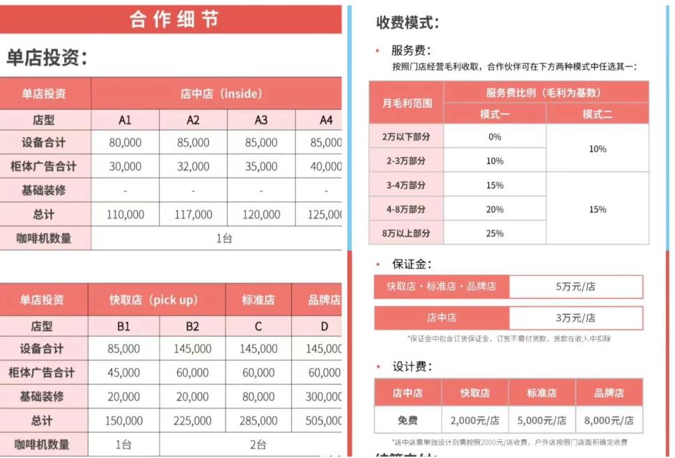 据了解,库迪咖啡目前的扩张采取了联营模式,除了装修、设备、原料等费用,不收取联营商固定费用 (可以理解为不收加盟费的加盟) ,而是从毛利率中抽成。