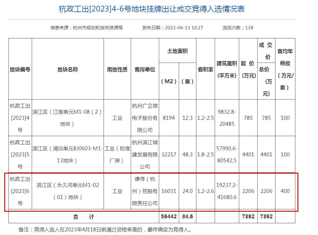 据钱江晚报报道,谦寻以总价2206万元拍得杭州滨江区永久河单元M1-02(01)地块,该地块用地面积为16031㎡,总建筑面积41680.6㎡。土地用途为工业用地(创新型产业),产业准入为计算机、通信和其他电子设备制造业。该地块位于滨江区互联网小镇,南侧为大华股份,东侧为恒生电子,不远处还有阿里巴巴、网易、海康威视等巨头环伺,整体产业氛围浓厚。