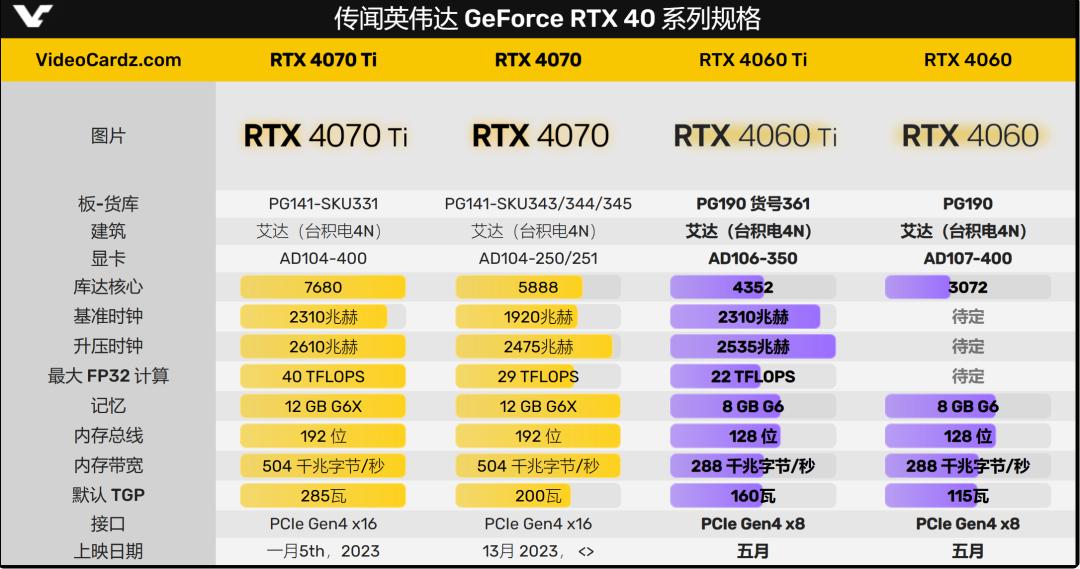 不仅如此,RTX 4060Ti配备了GDDR6显存,而已知的RTX 40系显卡乃至新版3060Ti都用上了GDDR6X显存。