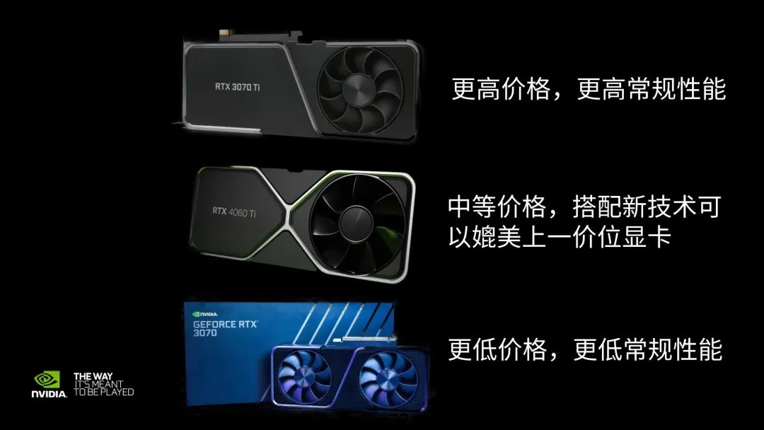 为了保障合作厂商的利益,尽可能多地处理掉RTX 30系列显卡,RTX 40系列显卡自然不能成为全方面超越前代产品的存在,反而更像是为用户提供了一款和前代同价位产品性能相近,但是价格相对便宜一些的选项,填补了旧款显卡之间空余的价格区间。