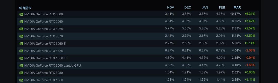 根据Steam官方数据显示,在矿潮退去后,RTX 3060已经取代了老前辈GTX 1060的位置,成为了主流游戏玩家中占有率最高的显卡,而在显卡占有率前十的统计中,英伟达「60」系显卡赫然占据了一半以上的位置,可见玩家对该系列显卡的认可度。