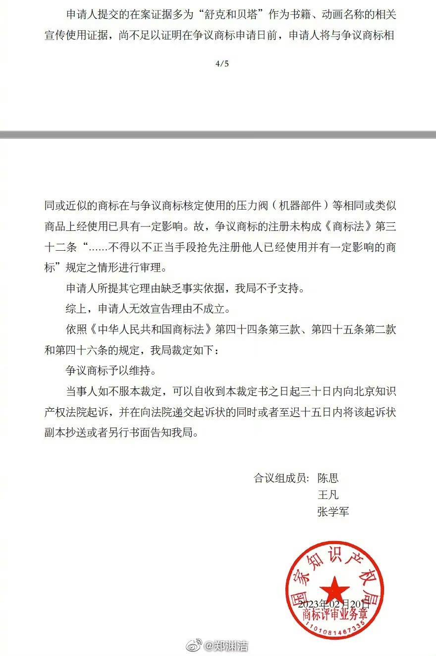 理由也不复杂,知识产权局解释的也很清楚,那就是郑渊洁提交的关于“舒克和贝塔”的证据,大多都是作为书籍、动画名称的相关宣传使用证据,而这两家公司使用的“舒克”核定使用的是压力阀(机器部件)等相同或类似商品。