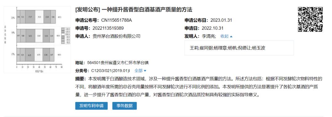 据国家知识产权局公开信息显示,年初,茅台申请公布其专利发明结果,命名为“一种提升酱香型白酒基酒产质量的方法”。