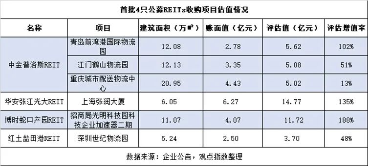 溢价的现象同样出现在收购标的本身的估值上。观点新媒体统计,首批扩募涉及的项目账面价值从成本法变更为公允价值模式后已出现了较大幅度改善,按照100%收益法评估,6个项目平均估值增值率约达96%。