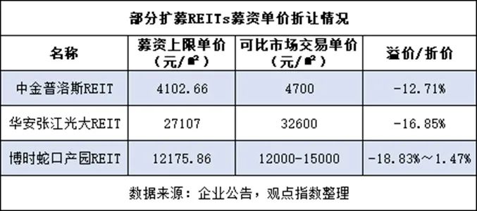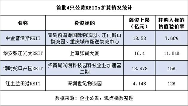 溢价方面,4只REITs募资上限额均较收购项目的估值有所溢价,溢价率在7.60%-15%之间。