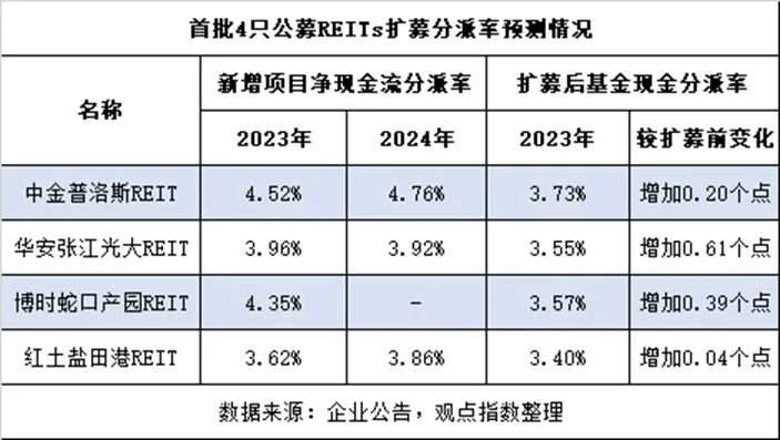 较低估值换来的是较为理想的收益率。按最高发售金额计,中金普洛斯REIT等4只REITs预计2023年新增项目净现金流分派率平均将达到4.11%,由此拉升了扩募后基金的整体分派率。