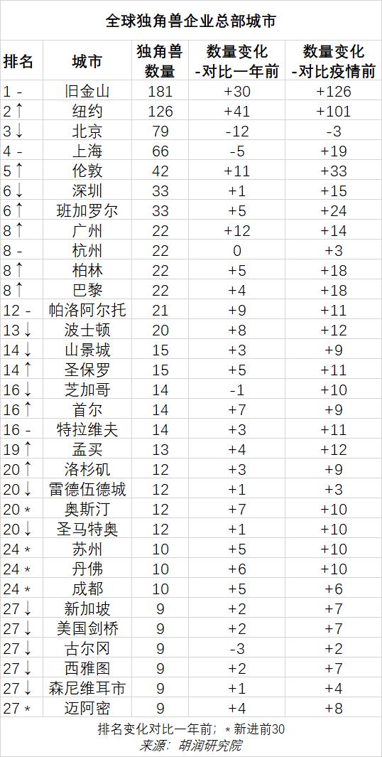 广州与杭州,均以22家独角兽并列全球第八。