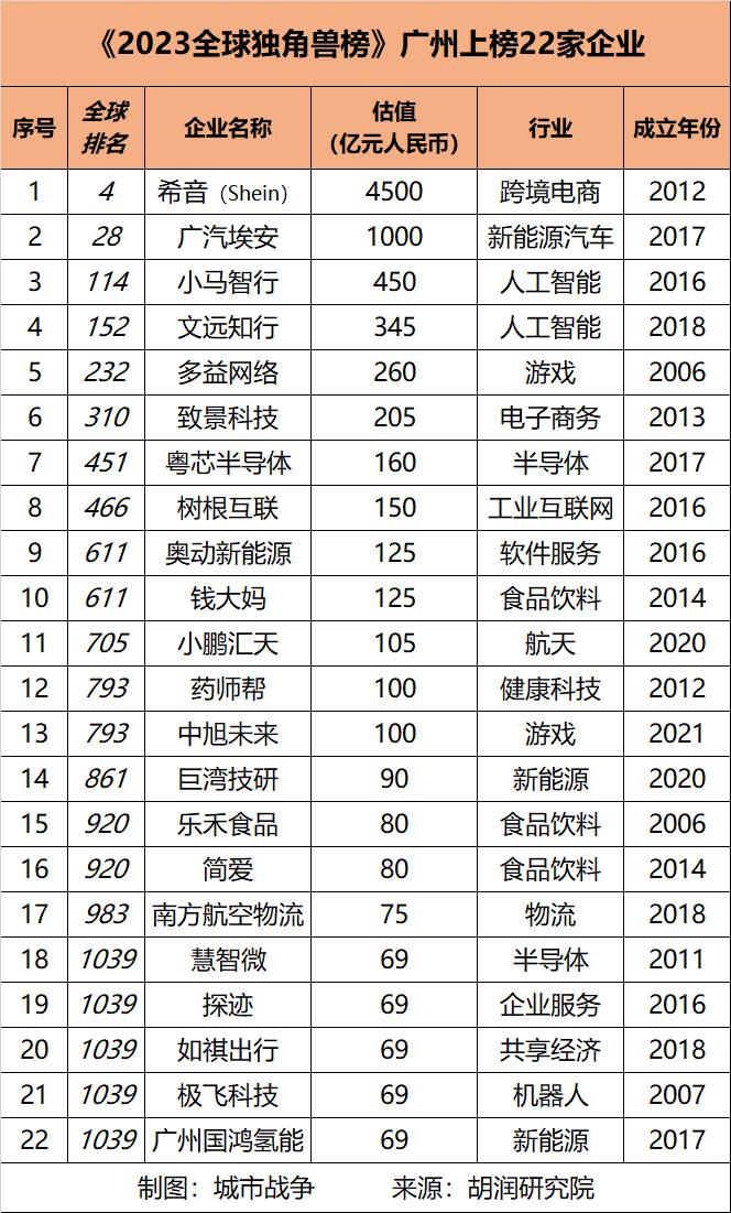 广州上榜的两家千亿级独角兽分别是希音(Shein)和广汽埃安,百亿级独角兽也达到13家。