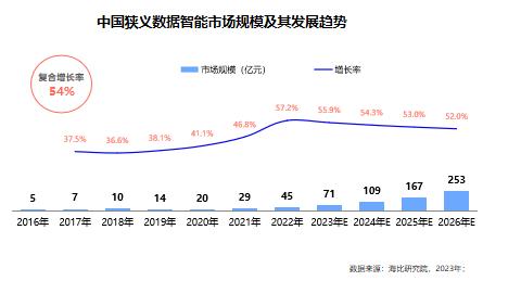 海比研究院数据表明,中国狭义数据智能市场规模 2022 年为 45 亿元,预计未来五年将保持高速增长,年复合增长率达 54%。