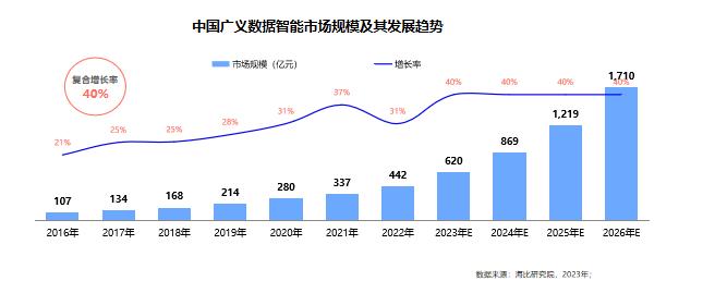 报告还指出,中国广义数据智能市场规模 2022 年为 442 亿元,预计未来五年将保持高速增长,年复合增长率达 40%。