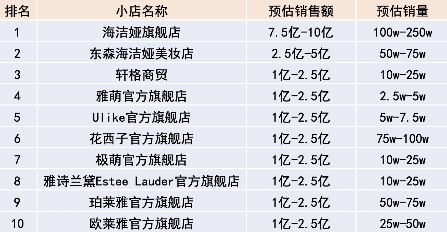在美妆榜单中位居它之后的花西子、雅诗兰黛、珀莱雅、欧莱雅,则分列第6、8、9、10名,月销售额都在1~2.5亿元,仅有海洁娅的1/4。