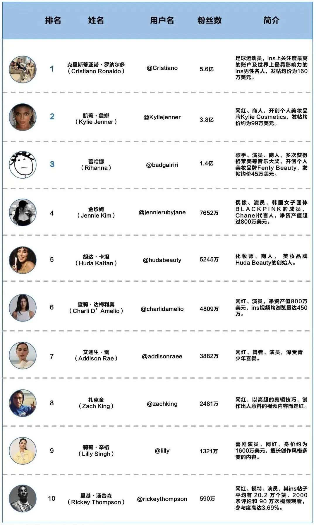 图注:2022年Instagram平台前十大网红(来源:Instagram,戴菡绘图)