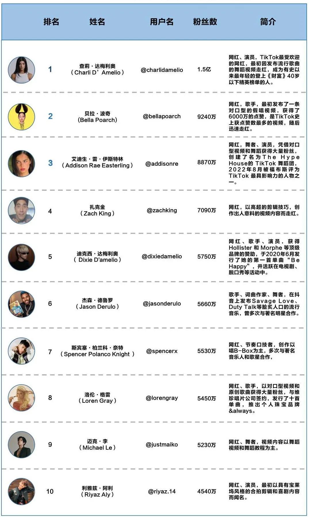图注:2022年TikTok平台前十大网红(来源:年Instagram,戴菡绘图)