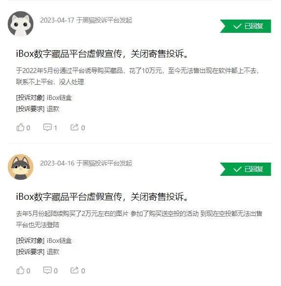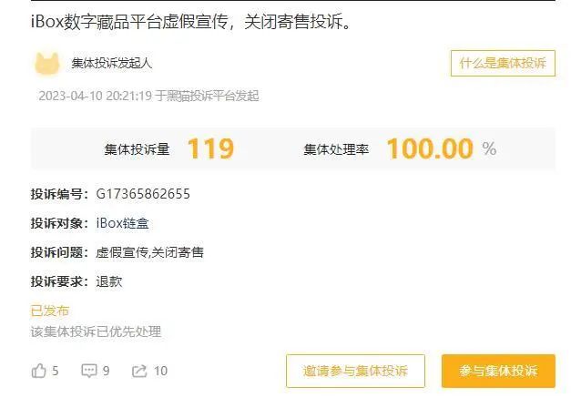 截至目前,在黑猫投诉平台上,集体投诉发起人于4月10日发起的集体投诉,数量已达119起,这些投诉的投诉对象均为iBox链盒,投诉问题主要为虚假宣传、关闭寄售,投诉要求为退款。此外,在消费保平台上,也有玩家用户投诉iBox。