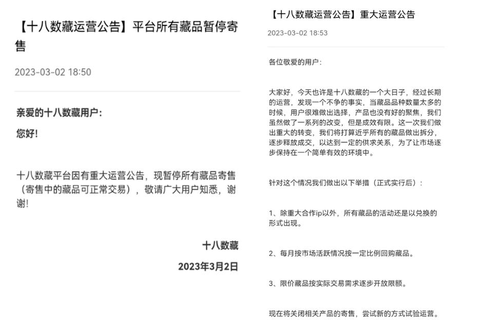 早在今年3月2日,头部平台之一的十八数藏就发布公告称,因有重大运营公告,现暂停所有藏品寄售(寄售中的藏品可正常交易)。该消息一出,便引发数藏行业的关注与讨论。