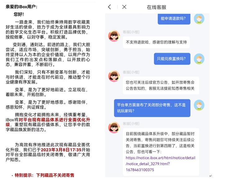 每经记者了解到,这些投诉最早源于iBox在3月初发布的一则公告。公告称,公司于2023年3月8日17:35对全部藏品进行临时关闭寄售(部分藏品不关闭寄售),后续藏品开放寄售时间请关注官方公告。