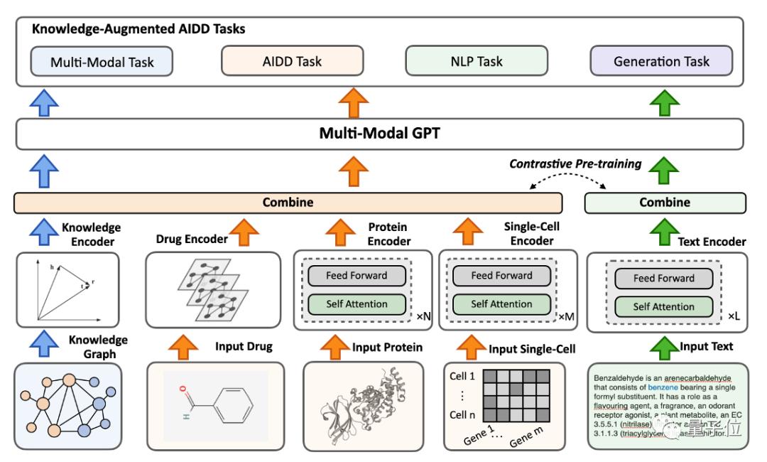整体来看,它是一个具备多个输入Encoder的模型,这些Encoder会先分别处理不同模态的输入,如分子、蛋白质和文献等。