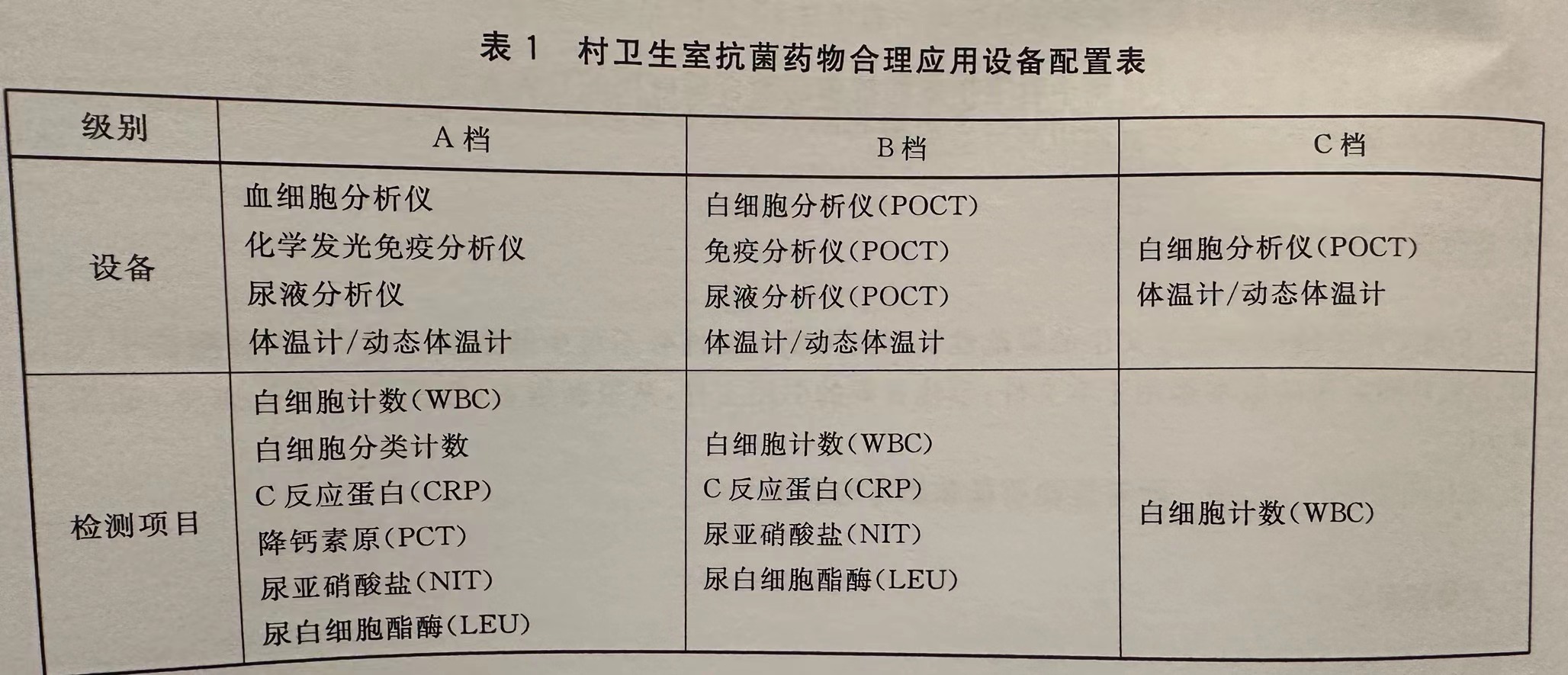 在此次发布的村卫生室“抗菌药物合理应用设备配置”团体标准中,将设备配置分为A、B、C三档,档位划分与卫健委发布的《村卫生室服务能力标准(2022版)》一致。其中,B档、A档是提高村卫生室业务能力的增强配置,C档位基础配置。下图为详细的设备配置表: