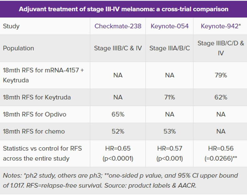 4月16日,默克和Moderna在AACR大会上公布名为KEYNOTE-942,关于mRNA疫苗mRNA-4157与K药联用作为完全切除的III/IV期黑色素瘤患者II临床数试验具体数据。临床结果显示,相较于单独使用K药的黑色素瘤患者,使用mRNA疫苗与K药联合治疗的患者死亡或复发风险降低44%。