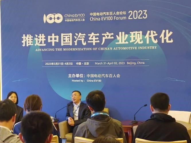 中国电动汽车百人会论坛期间,朱江明接受媒体群访 车百智库摄