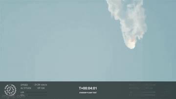 在发射台的滚滚白烟之中,星舰直冲云霄,并一路加速到达接近4万米高空。但就在发射约3分30秒之后,星舰并没能如期完成与重型助推器的分离,火箭姿态在高空中失去稳定,旋转下坠之后发生爆炸解体。近年来人类太空领域最重要的一次测试宣布以失败告终。